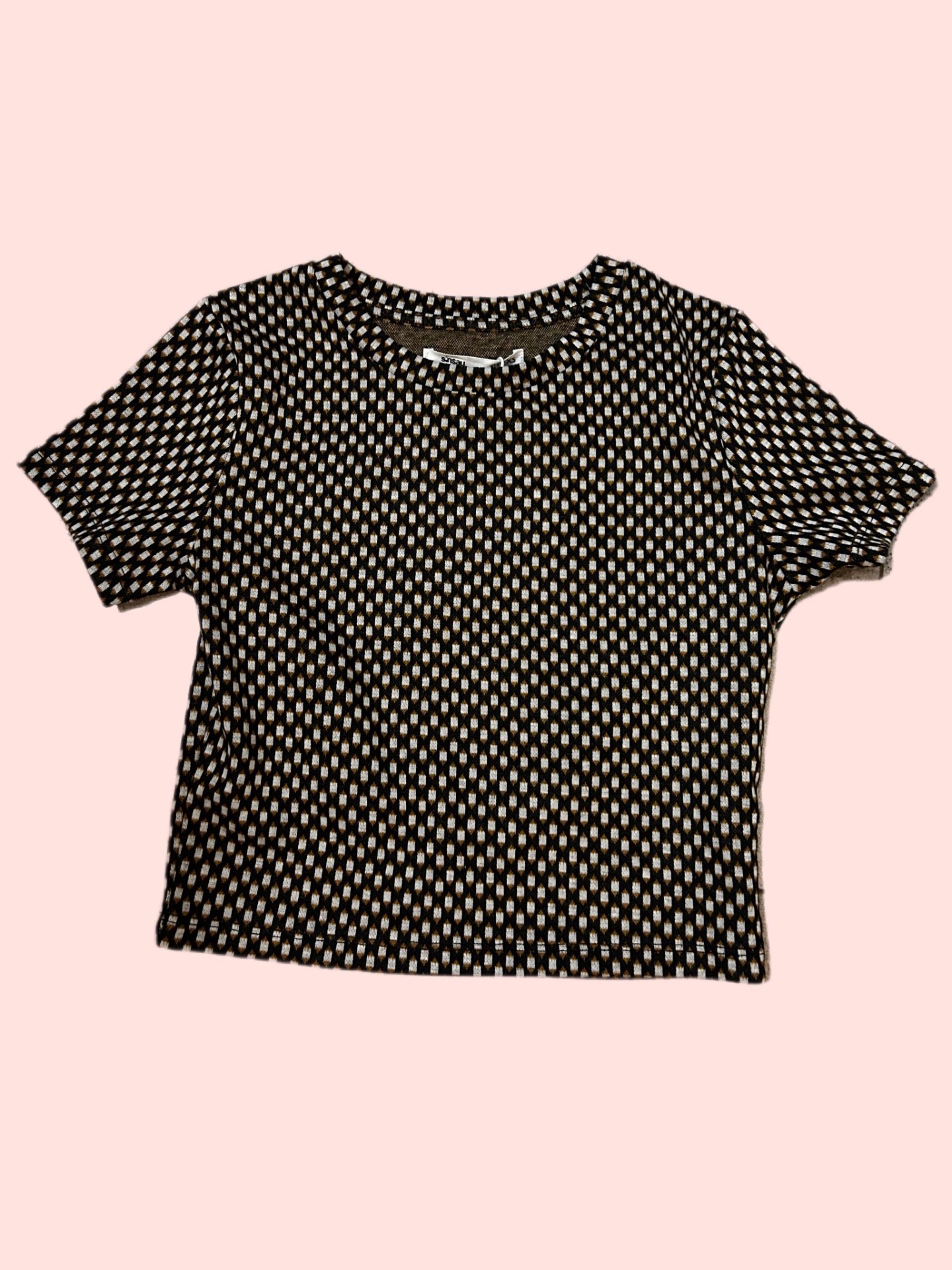 Štýlové dámske tričko s krátkym rukávom a jemným geometrickým vzorom v čiernej a bielej farbe.
