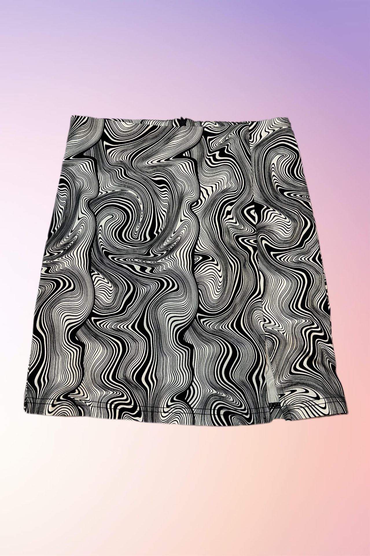 Trendy mini sukňa s výrazným psychedelickým čiernobielym vzorom, ktorý pôsobí moderne a originálne. Vyrobená z pohodlného a mierne elastického materiálu, skvele sedí na postave a zvýrazňuje siluetu. Perfektná voľba na leto, párty alebo mestské outfity – stačí ju doplniť jednofarebným topom.