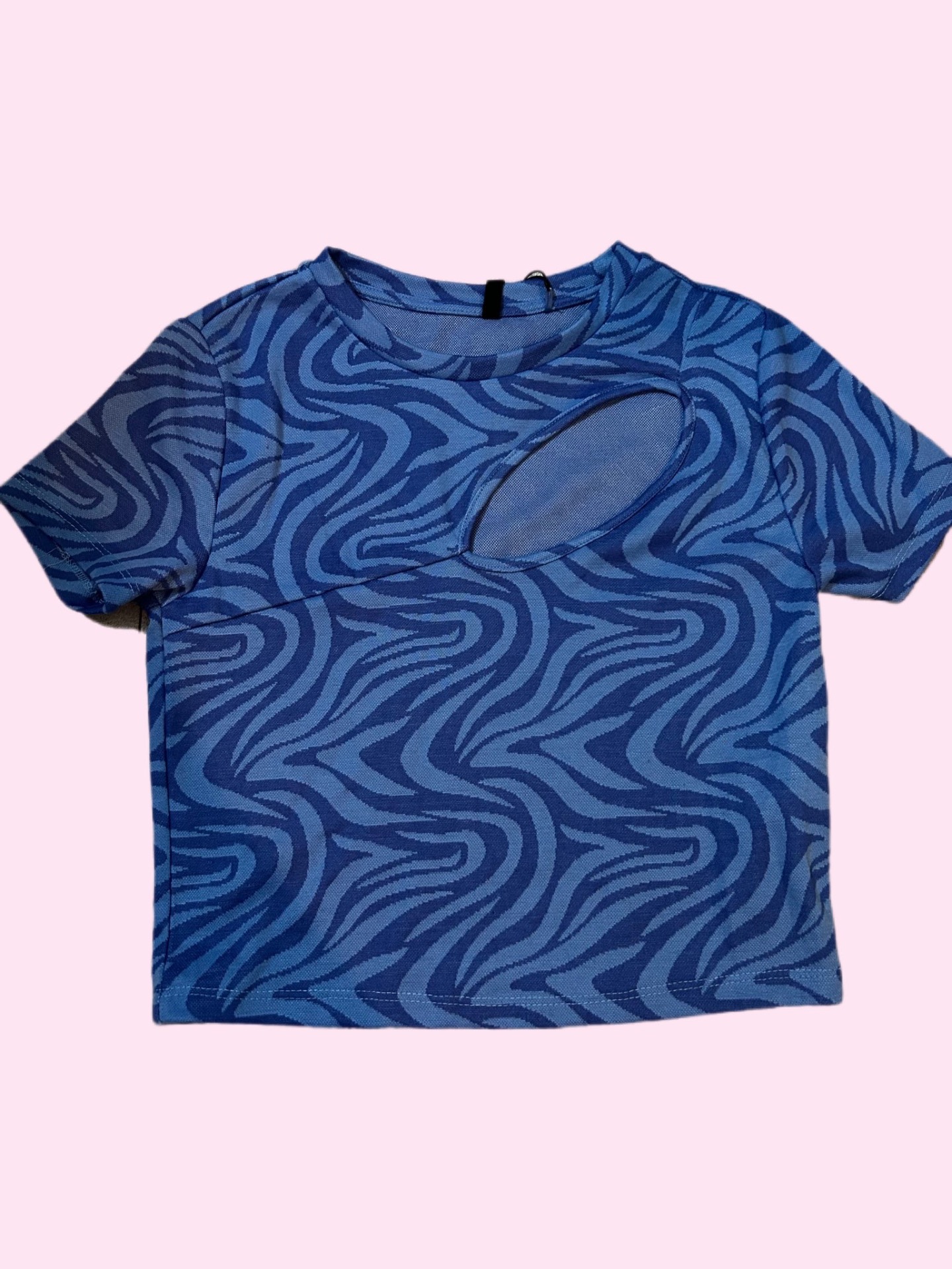 Moderné krátke dámske tričko v odtieňoch modrej so zebra vzorom. Zaujímavým prvkom je výrez v oblasti hrudníka, ktorý dodáva outfitu štýlový a odvážny vzhľad. Tričko má krátke rukávy a priliehavý strih, ktorý pekne zvýrazní postavu.