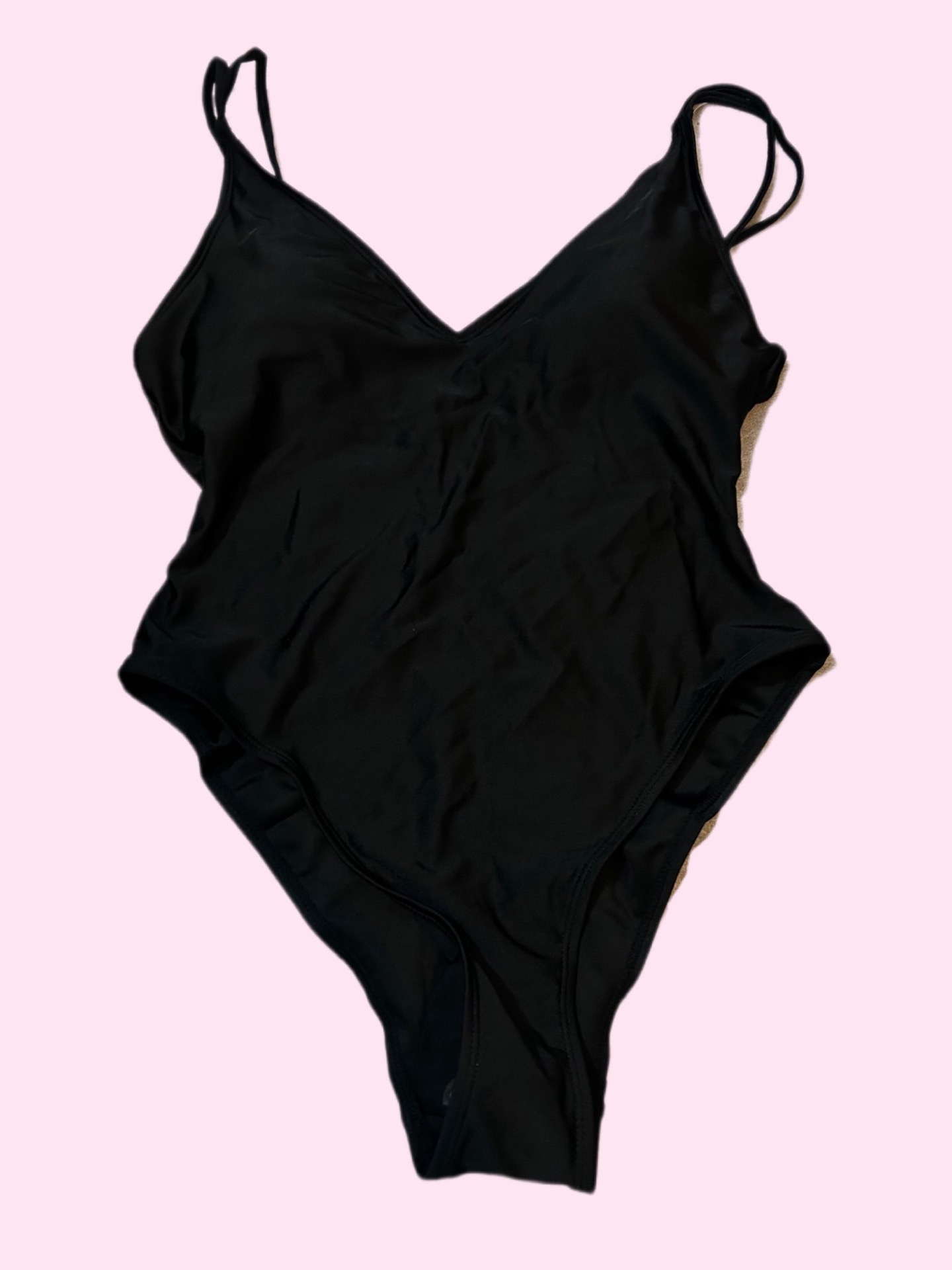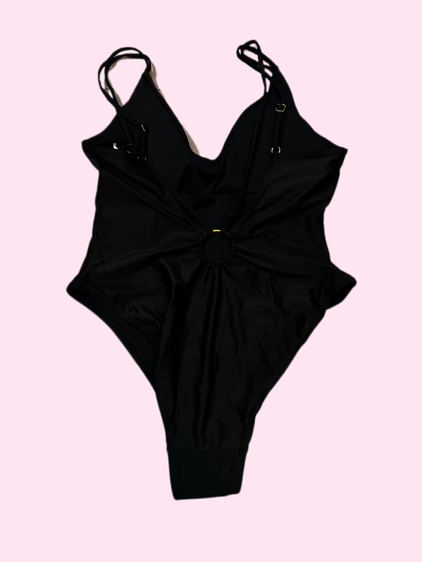 Elegantné čierne jednodielne plavky s klasickým výstrihom vpredu a originálnym okrúhlym ozdobným detailom na chrbte. Plavky majú nastaviteľné tenké ramienka, ktoré zabezpečia pohodlné nosenie a ideálne prispôsobenie postave. Vysoký strih na bokoch opticky predlžuje nohy a lichotí postave.
