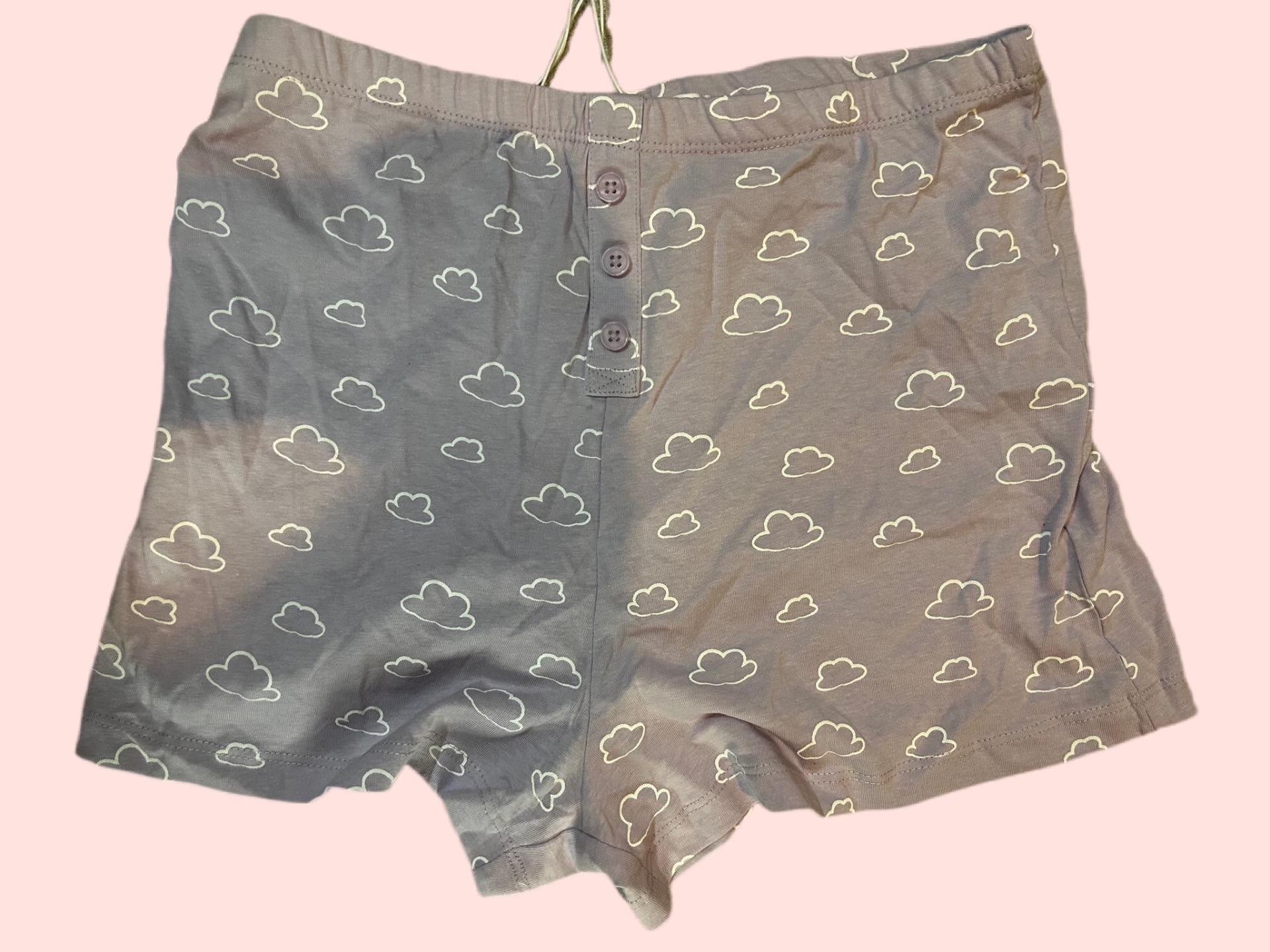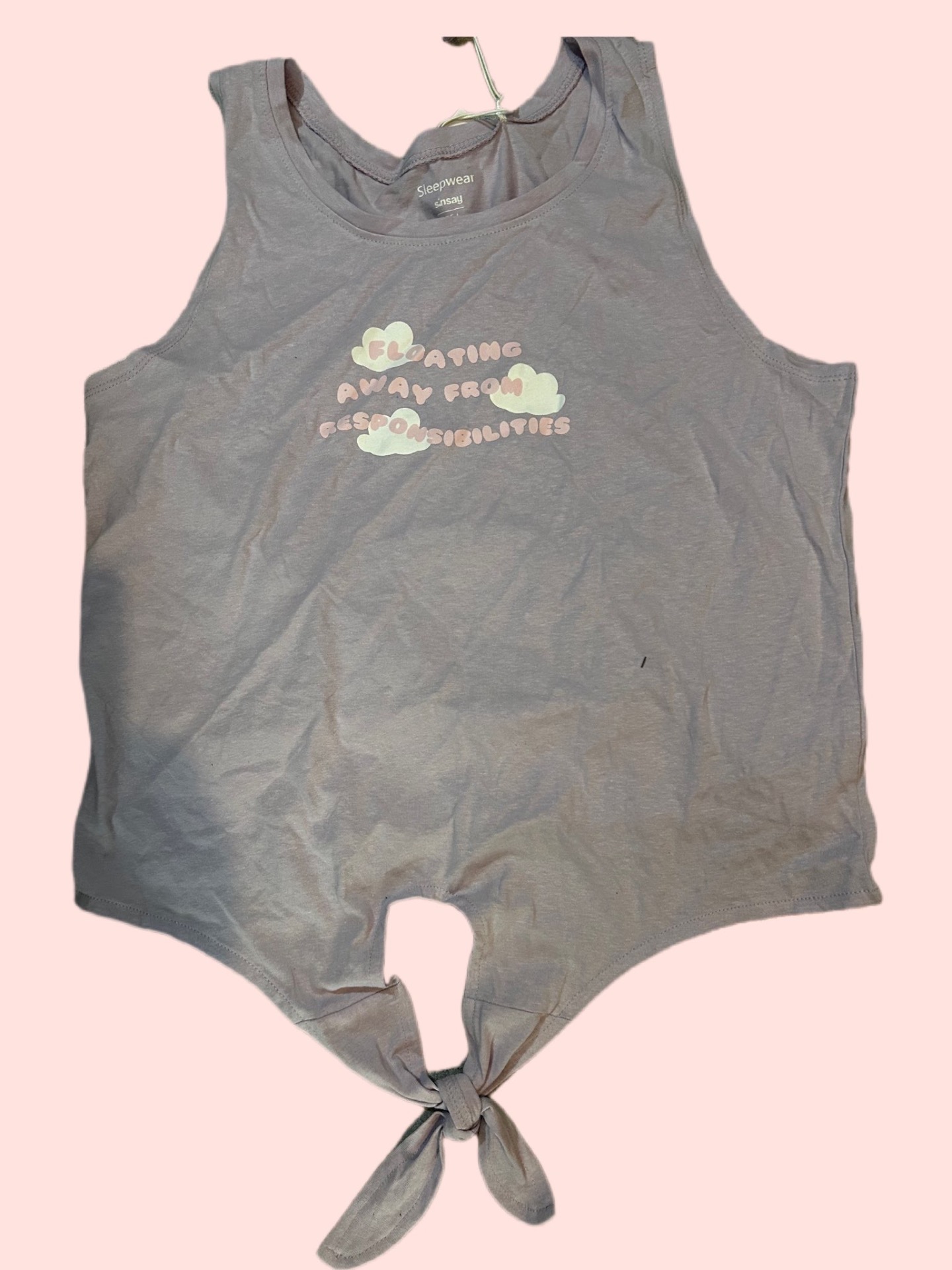 Rozkošné a pohodlné dámske pyžamo v jemnom levanduľovo-fialovom odtieni, ideálne na pokojné večery a sladké sny. Skladá sa z dvoch častí – voľných kraťasov s bielymi obláčikmi a tielka s uzlom vpredu, na ktorom je nápis "Floating away from responsibilities" v ružovo-bielej farbe. Materiál je mäkký, priedušný a príjemný na pokožke, vhodný na teplé noci.