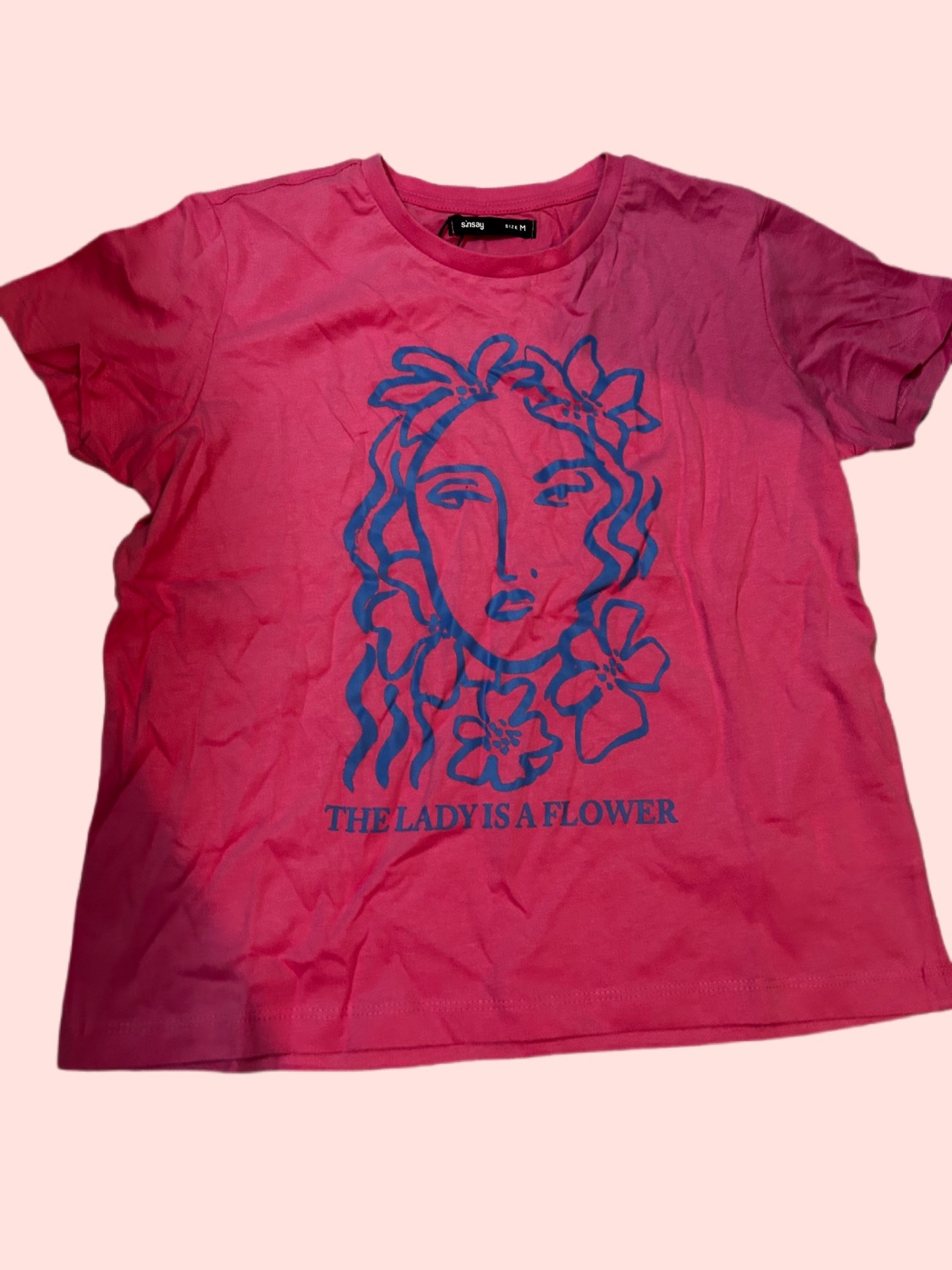 Štýlové ružové dámske tričko s originálnou modrou potlačou ženského motívu a nápisom "The lady is a flower". Tričko má klasický rovný strih, krátke rukávy a pohodlný bavlnený materiál, ideálny na bežné nosenie. Výrazný dizajn dodáva outfitu umelecký a moderný vzhľad.