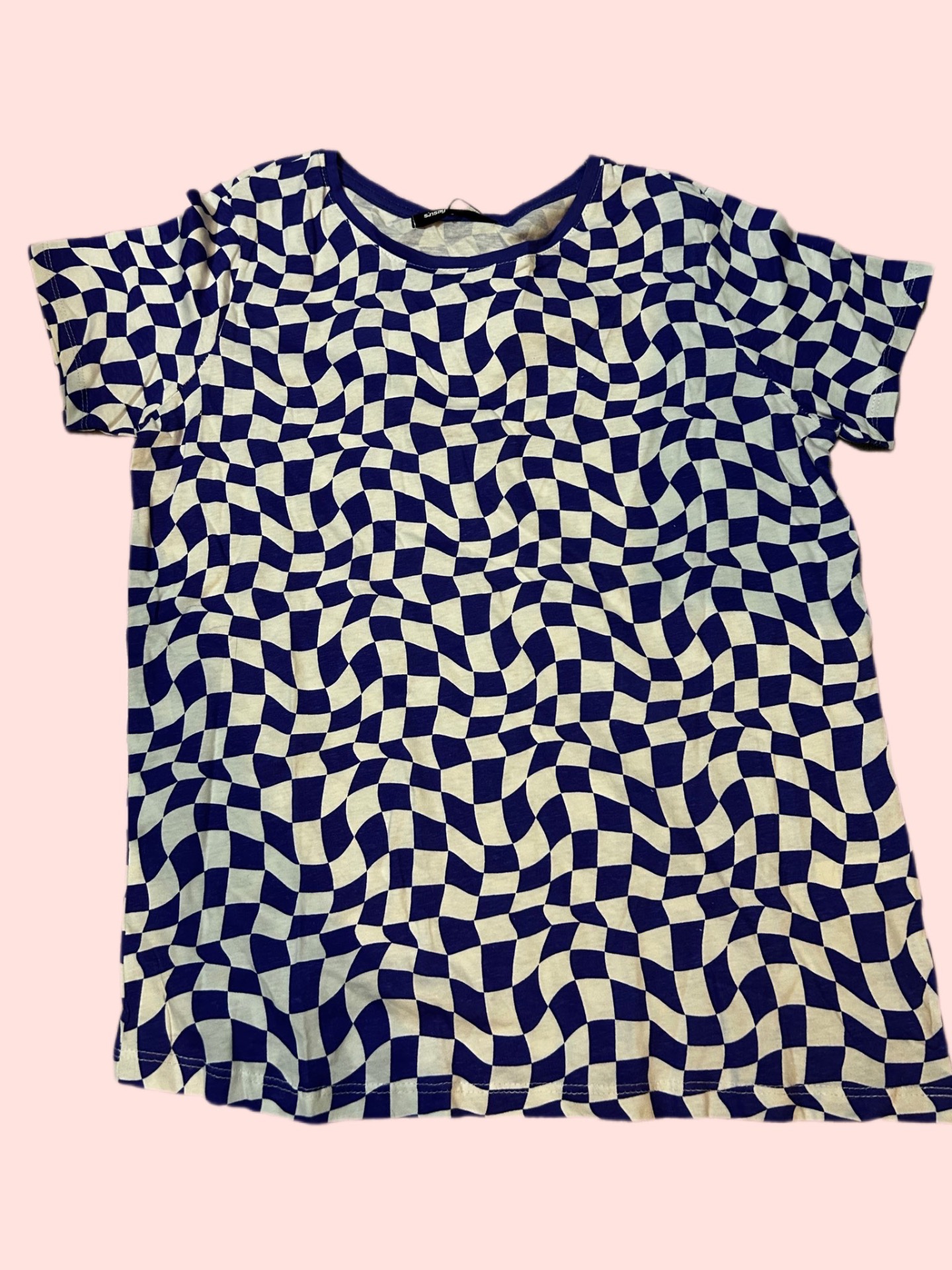 Trendy dámske tričko s optickým vzorom v modro-bielej kombinácii. Moderný "wavy check" motív vytvára zaujímavý efekt, ktorý okamžite pritiahne pozornosť. Tričko má klasický strih s krátkymi rukávmi a okrúhlym výstrihom, ideálne na leto alebo ako výrazný kúsok do streetwear outfitu.