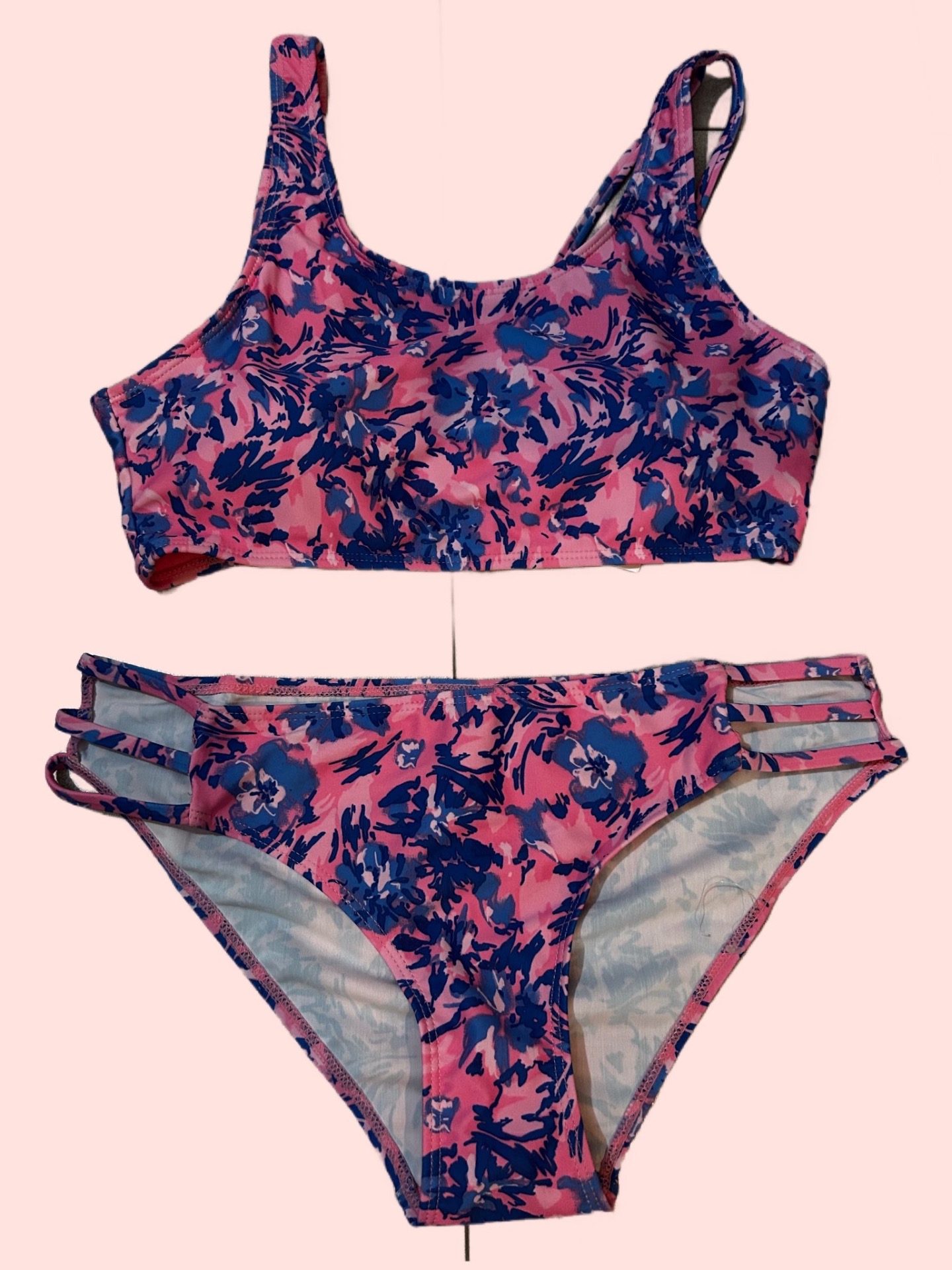 Trendy dvojdielne plavky – bikiny s výrazným ružovo-modrým kvetinovým vzorom. Vrchný diel má športovo-elegantný strih so širokými ramienkami pre pohodlie a oporu. Spodný diel je ozvláštnený trojitým pásikovým detailom na bokoch, ktorý pôsobí moderne a zmyselne.