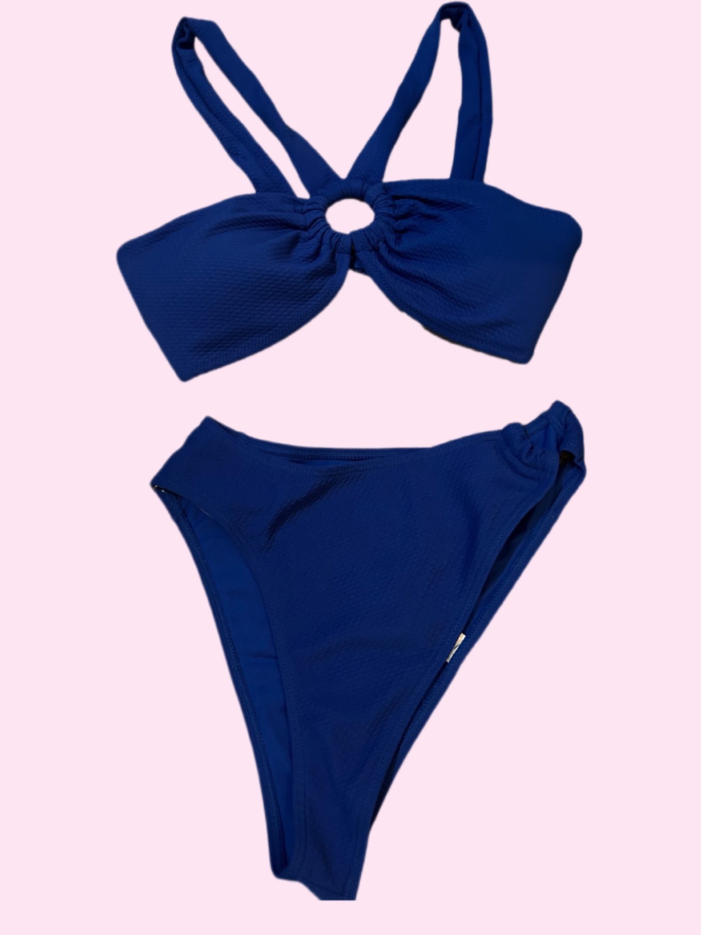 Elegantné dvojdielne bikiny v sýtej tmavomodrej farbe, ktoré zaujmú svojím originálnym dizajnom. Vrchný diel má viazanie za krkom a štýlový okrúhly prstenec v strede, ktorý dodáva moderný a ženský vzhľad. Spodný diel je vysokého strihu, opticky predlžuje nohy a zvýrazňuje pás.