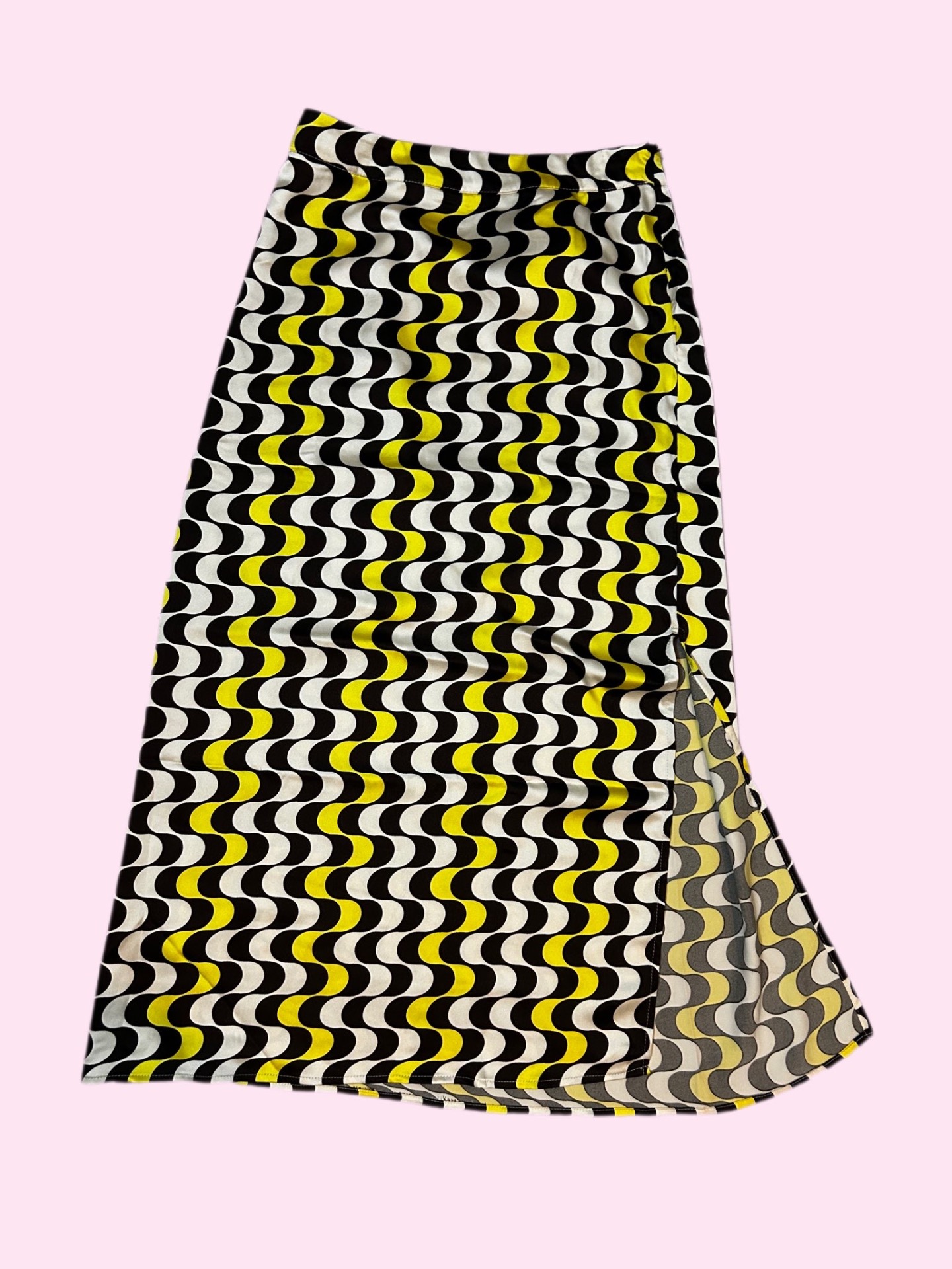 Originálna midi sukňa s moderným retro vzorom v kombinácii čiernej, bielej a žltej farby. Pôsobí sviežo a hravo, vďaka čomu sa hodí na bežné nosenie aj letné výlety. Sukňa má ľahký padavý materiál a malý rozparok na boku, ktorý zvýrazňuje ženskosť a pohodlie pri pohybe.
