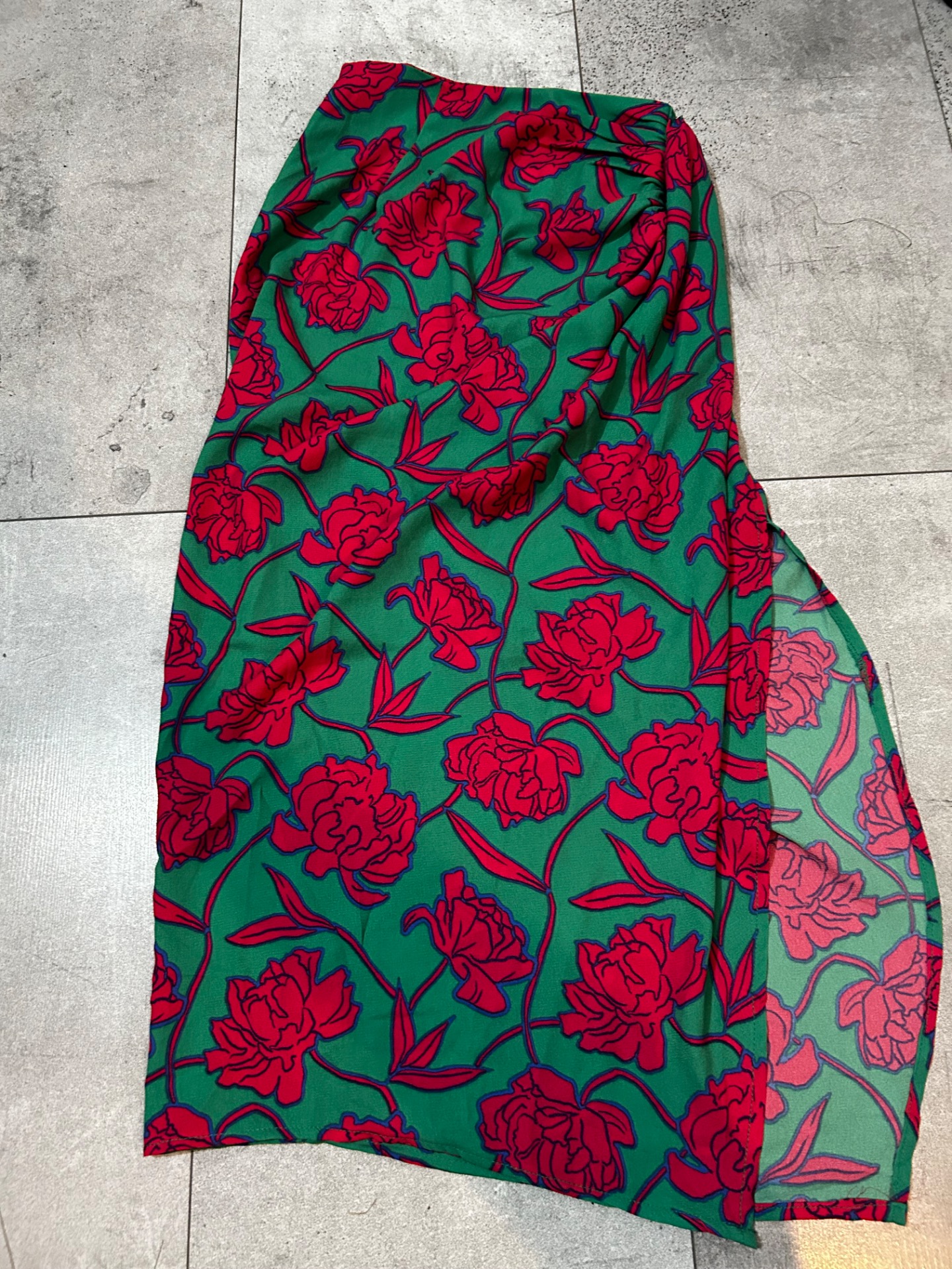 Výrazná letná sukňa so živým červeným kvetinovým motívom na zelenom podklade. Materiál je ľahký a vzdušný, ideálny na teplé dni. Sukňa má rovný strih a pôsobí elegantne aj odviazane – dá sa kombinovať s jednoduchým topom alebo tielkom.